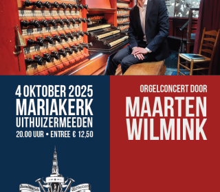 Mariakerk Torenstraat 26 UithuizermeedenOp zaterdag 04 oktober, aanvang 20:00 uur, neemt Maarten Wilmink plaats aan de speeltafel van het Hinsz-orgel in de Mariakerk van Uithuizermeeden.