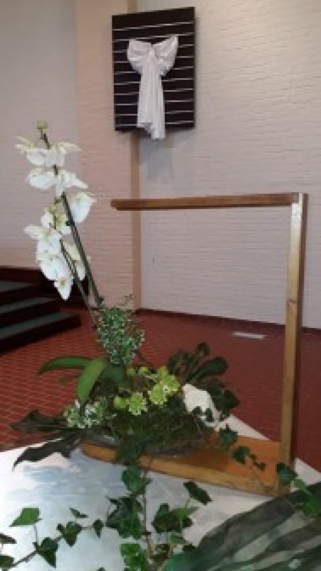 De grote kloostermop waar het bloemstuk op staat symboliseert De Hoeksteen, waar wij in mogen vertrouwen.