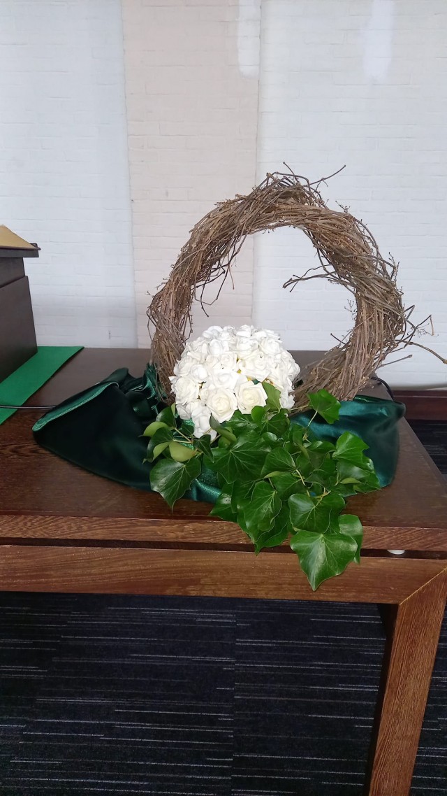 De basis van dit bloemstuk zijn de bladeren van de klimop, symbool voor trouw van jouw Hemelse Vader.