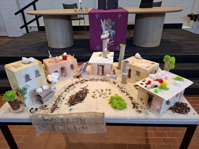 Vandaag hoorden wij tijdens de lange kindernevendienst het verhaal van Naomi en Ruth, die ook op weg waren naar Betlehem. Daarna hebben de kinderen de stad Betlehem gemaakt, door bomen, wegen, rivieren, bruggen en dieren te knutselen. Het is echt prachtig geworden! Vandaag zijn Naomi en Ruth bij hun eigen huisje geplaatst. Elke zondag komt er een hoofdpersoon uit het Bijbelverhaal bij zijn of haar huis te staan. En zo gaan wij gaan op weg naar Betlehem en eindigen op eerste Kerstdag met de geboorte van Jezus.